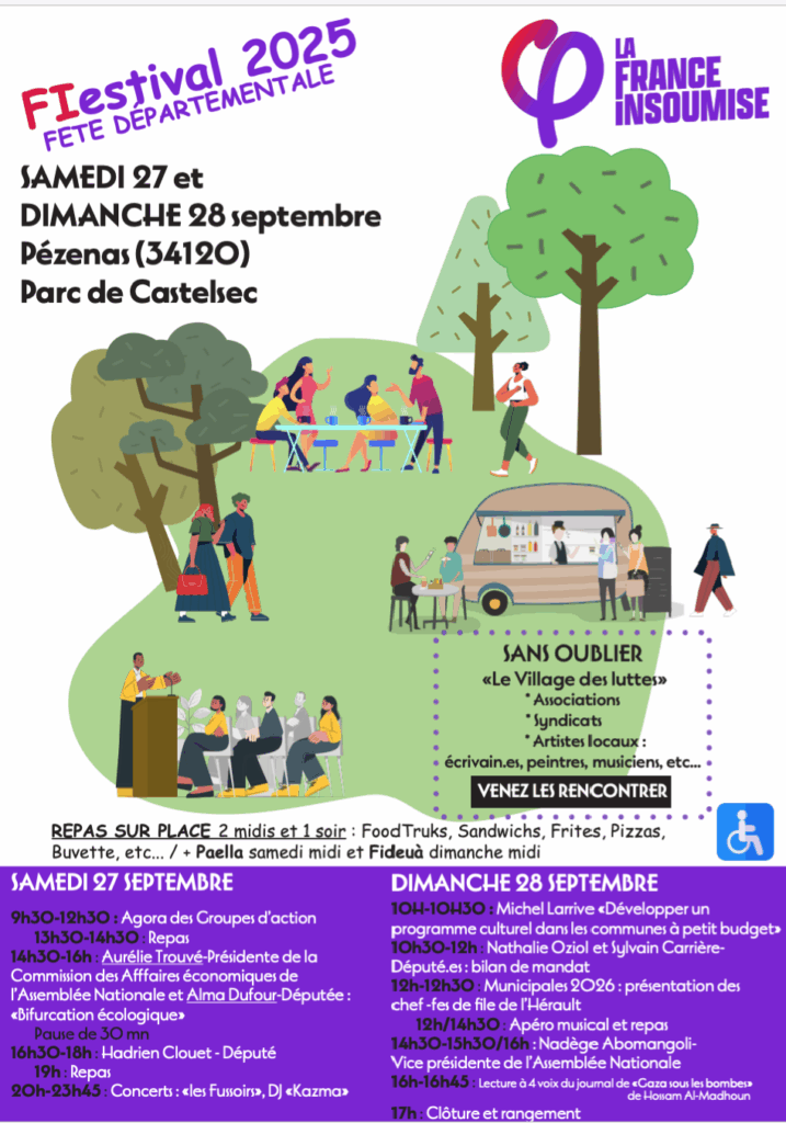 FIestivale 2025- Pézenas 27-28 sept 2025SANS OUBLIER : Village des luttes, associations, syndicats, artistes locaux psl29 août 2025Evènements locaux