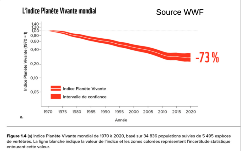 Dans son rapport « Planète vivante » d’octobre 2024 (à visualiser ou télécharger ci dessous), le Fonds mondial pour la nature (WWF) indique une diminution continue depuis 1970 des espèces vertébrées sauvages, atteignant 73 % en 2024 ! Cette diminution était de 60 % en…